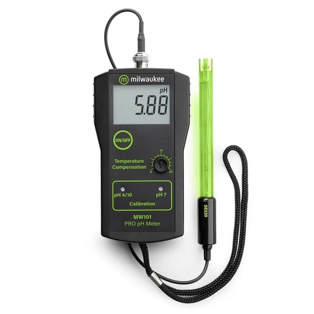 Milwaukee MW101 PRO pH Meter er et præcist og brugervenligt instrument, som er designet til at måle pH-værdien i væsker med en meget høj nøjagtighed. Det er ideelt til både professionelle og hobbybrugere, der har behov for præcise målinger i laboratorier, akvarier, eller i deres gartneri. MW101 er udstyret med en robust SE220 pH-elektrode, der med et 1-meter langt kabel, sikrer pålidelig og konsistent måling under forskellige forhold. Denne pH-måler giver en opløsning på 0,01 pH, og en nøjagtighed på ± 0,02 pH, hvilket gør den til et godt valg til krævende applikationer, hvor præcision er ekstra afgørende. Enheden har manuel temperaturkompensation, som tillader præcise målinger i temperaturer fra 0 til 50°C, og den er designet til at kunne operere under vanskelige miljøforhold, med en maksimal luftfugtighed på 95%.