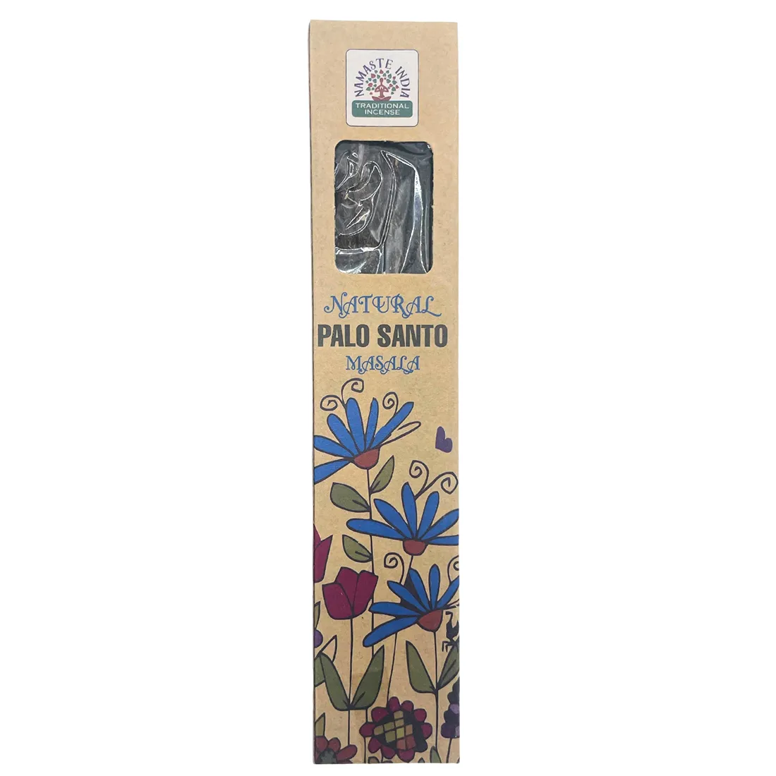 Natural Masala Palo Santo er en håndrullet røgelse fra Indien, med den karakteristiske duft af det hellige træ, Palo Santo. En mild træagtig aroma, med lidt strejf af citrus og mynte, der skaber ro, renser luften for uønskede lugte, og løfter generelt stemningen. Disse pinde er lavet på naturlige botaniske ingredienser, og brænder rent og længe, helt uden syntetisk skidt eller animalske tilsætninger. De kommer i en flot og farverig æske, som både holder dem friske og pynter på hylden. Brug dem til meditation, en stille stund, eller bare når du vil skabe en afslappende stemning i rummet.
