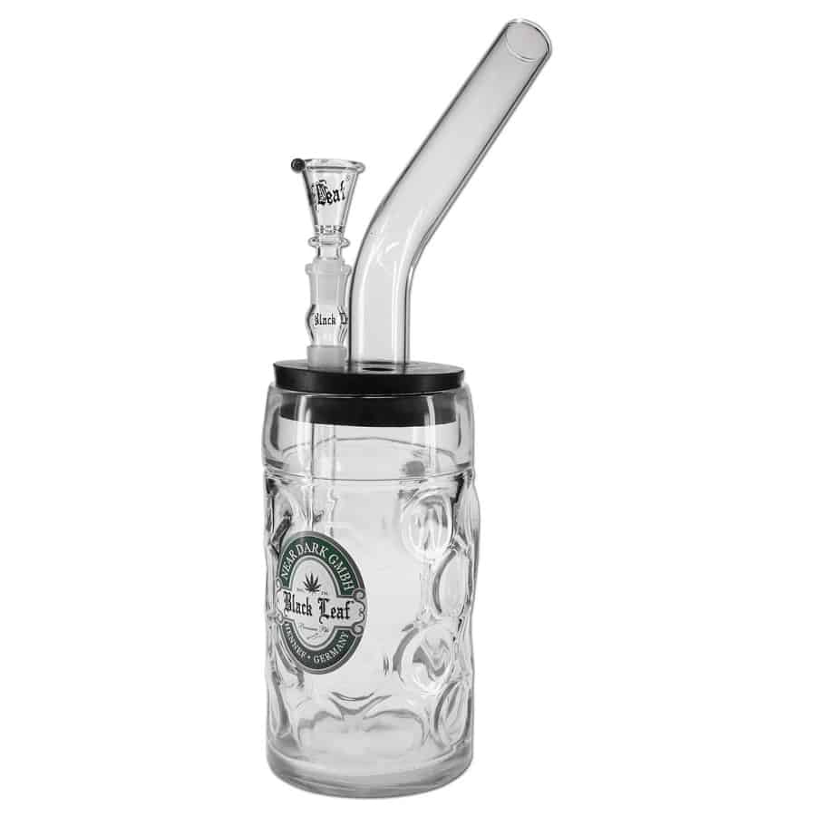 Med denne ølbong fra Black Leaf, får du en sjov alternativ måde at ryge på, nemlig igennem et Oktoberfest øl krus. Den er fremstillet af 3,2 mm glas, og har et sliphul på toppen af gummiproppen, som desuden også holder et sugerør, samt slamrør, downtube og bonghovede. Ølbongen har et har Black Leaf motiv på siden, samt Black Leaf logo på både downtube og bonghovede. Vi anbefaler at bruge en bong rist på 15-16,5 mm til denne ølbong.