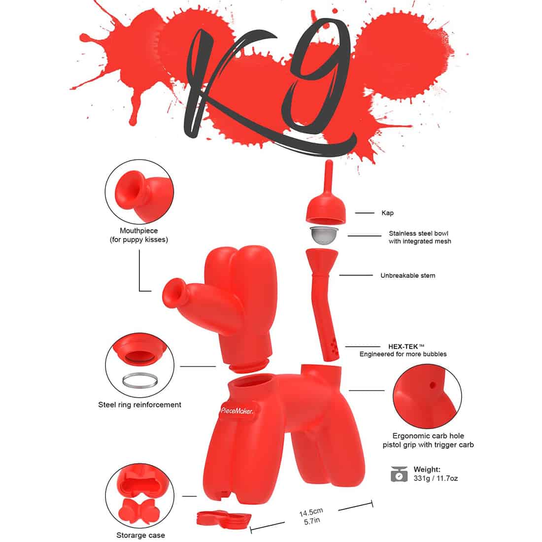 Sig hej til din nye bedste ven, PieceMaker K9 Ingvar! Denne elskelige hvalp er perfekt til alle, der leder efter en sjov og venlig tilføjelse til deres hjem. K9 bongerne er lavet af holdbart fødevaregodkendt silikone, og er dermed ekstra holdbar, samt bygget til at holde meget længe! Den integrerede mesh-diffusor med HEX-TEK-slids, giver et fantastisk bobelflow, mens det ergonomiske sliphul på siden gør den let at bruge. Den kommer med en indbygget stashboks, hvilket betyder at du altid kan have dit stash liggende, uden at frygte at uventede gæster finder det.  Så hvorfor ikke adoptere din egen PieceMaker K9 Ingvar? Den venter på at bringe kærlighed og latter ind i dit hjem, dog sørg for at give dit nye kæledyr masser af kærlighed, og naturligvis god grønt og en jævnlig rengøring!