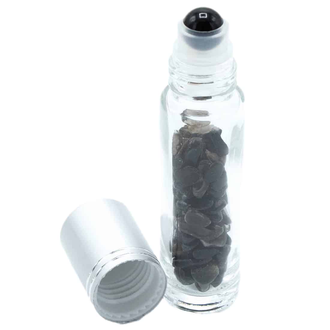 Dette er en roll on flaske med Sort Turmalin, der egner sig perfekt til æteriske olier, parfume olier, eller andre essenser. Sort Turmalin siges at være en god sten for dem, der er følsomme over for elektromagnetisk stråling, og for dem der arbejder med åndelig udvikling. Stenen menes også at hjælpe med at overvinde frygt og angst samt forstærke selvtillid.Roller Bottles er ideelle til at fylde med enhver væske ved blot at skrue gummidutten i toppen af flasken af, og opfylde med den ønskede æteriske olier, parfumeolier eller essenser.