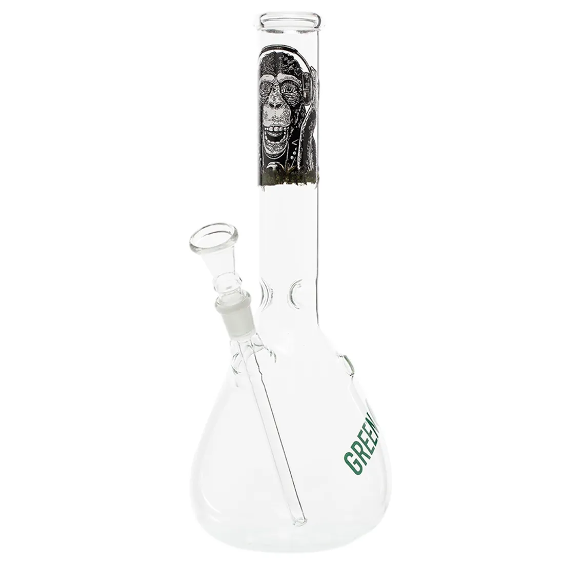 Denne Beaker Monkey bong fra Scott, kommer med en højde på 30 cm, og er en klassisk glasbong med et lille monkey twist. Den kommer nemlig med et abe-motiv på halsen, og den rummelige beaker kolbe giver mulighed for en stor mængde vand, hvilket sikrer en mere afkølet og behagelig røg, der kan køles ekstra meget ved hjælp af isterninger op langs halsen. Den kommer med et sliphul på siden, der gør det nemt at kontroller luftstrømmen når der skal inhaeres, og så leveres bongen med en “downpipe” hvor hovedet og slamrøret sidder sammen, så hvis du ønsker at skifte bonghovedet, skal du derfor købe både et hoved og slamrør separat. Vi anbefaler at bruge en spoon screen (ske rist) på 12 mm hertil, eller en 12,5 almindelig rist.