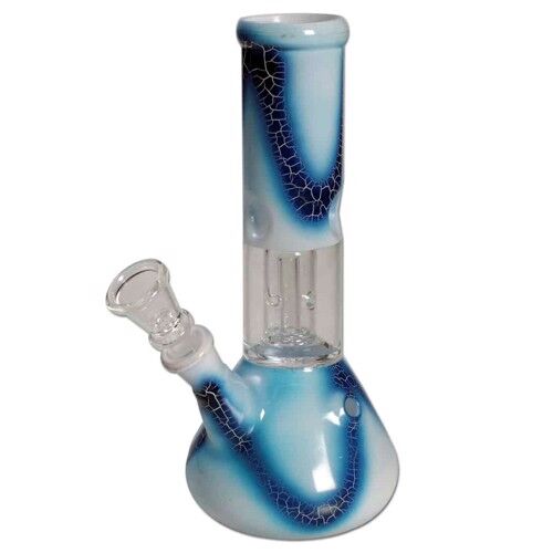 Denne lille og smarte glas bong med dome percolator, leverer en dejlig dobbelt afkølet røg, som først kommer gennem percolatoren, og dernæst den lille is-fanger som begge hjælper med at afkøle røgen. Den kommer med et sliphul på siden, og et bonghovede med en SG 14,5 mm størrelse. De mange hvide og blå nuancer som denne percoaltor bong har, opnås ved at male mange lag ovenpå hinanden, for dernæst at lægge et yderst lag og brænde det efter igen. En omstændig behandling og flot resultat.