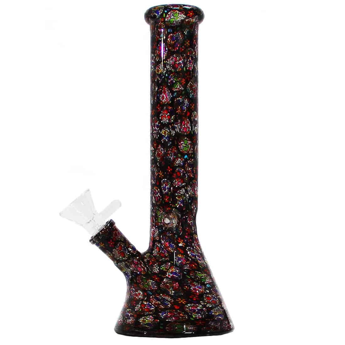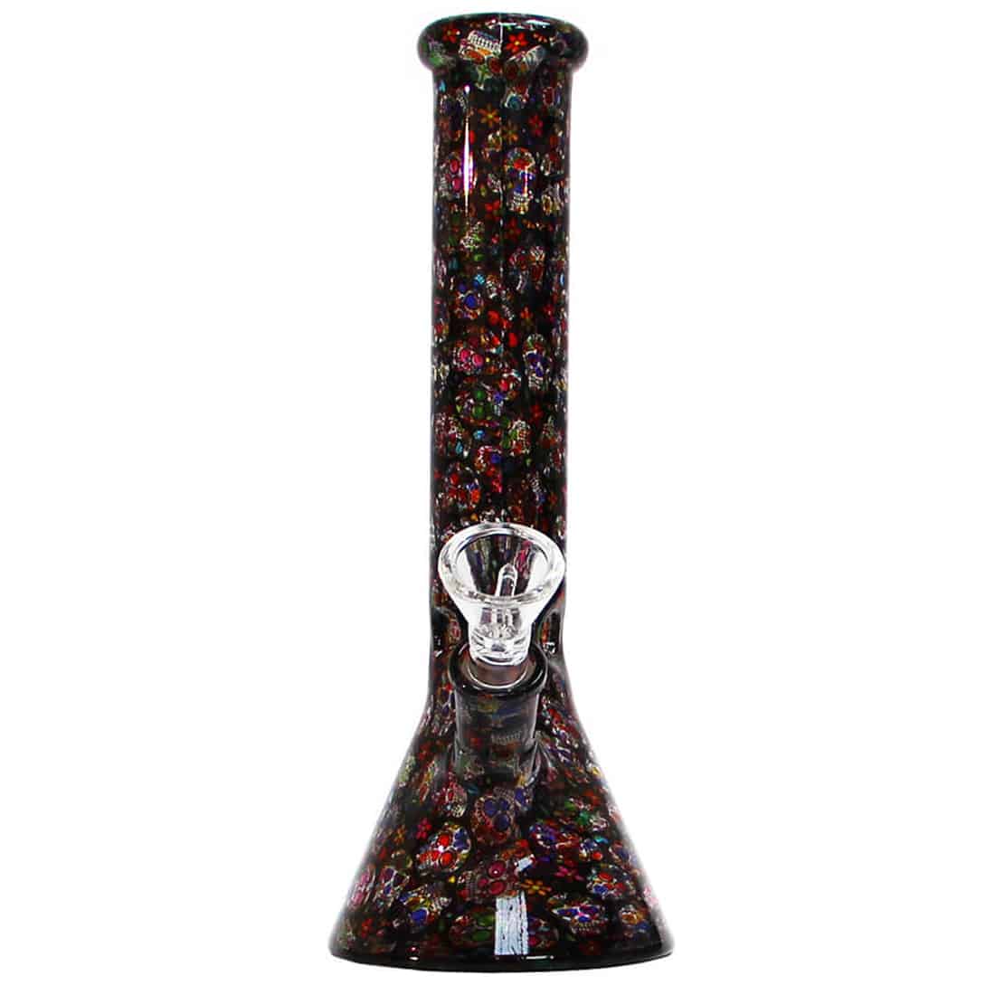 Leder du efter en sjov og unik bong, der vil være en god tilføjelse til din samling? Så tjek denne Scott Mexican Skulls Glas Bong ud, der er god reminder om de dødes dag d. 2 november: Dia de Los Muertos! Denne bong er lavet af sort glas i en 3 mm tykkelse, og har et indviklet kranie-design. Den står 26 cm høj, og har en diameter på 10 cm i bunden, samt 3,5 mm ved halsen. Det afrundede mundstykke gør det ekstra dejligt for læberne, og den dybe isfanger i bunden af halsen, sikrer at der er plads til ekstra mange isterninger op langs halsen, så du kan få en ekstra kølig røg. Den kommer uden et sliphul på siden, men tilgengæld med en hank på hovedet, der på den måde gør det nemt at suge røgen ind sammen med den friske luft, når det løftes op til sidst. En god begynder bong, som vi anbefaler at bruge en rist på 12,5 mm samme med.OBS: Bonghoved og slamrør sidder sammen, hvilket kaldes en downpipe. Ønskes et seperat hoved skal der tilkøbes et nyt slamrør med en længde på 95 mm, samt i en SG 18,8 mm størrelse.