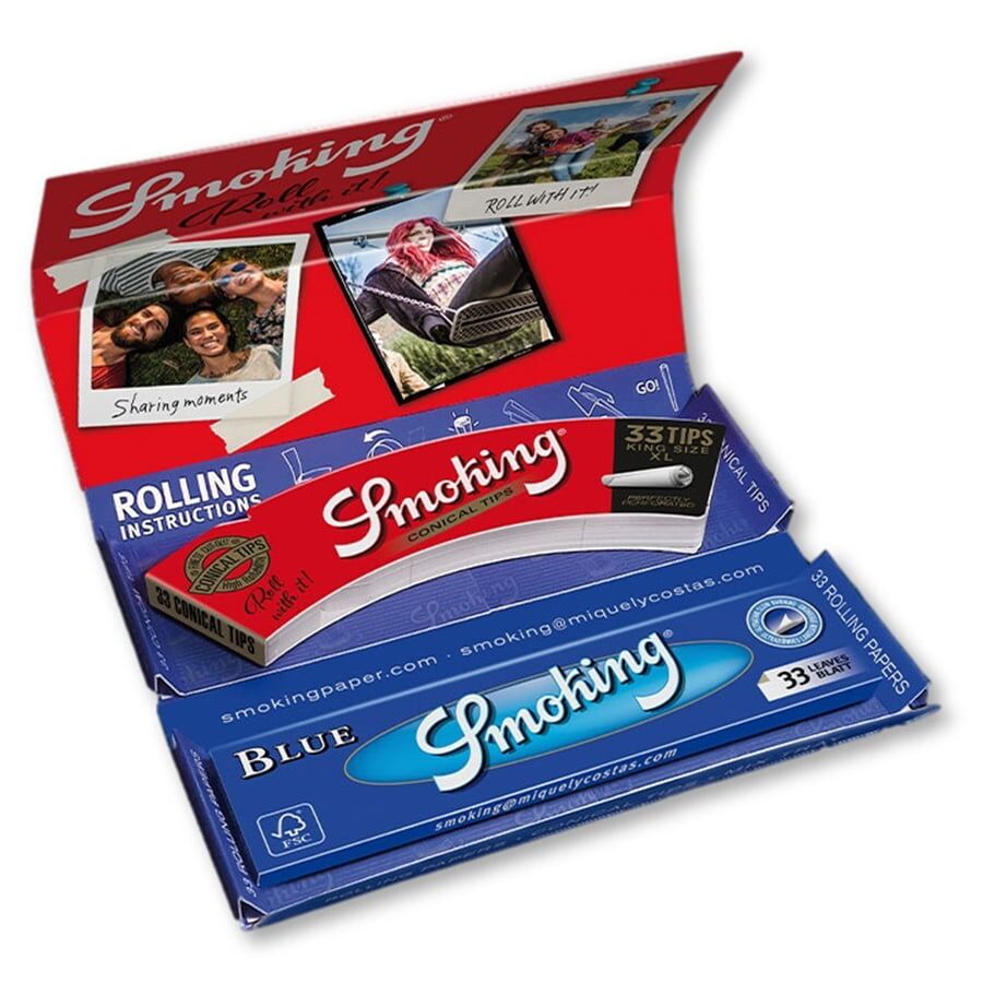 Med dette Blue Smoking Luxury kit, får du næsten alt det du skal bruge for at rulle en stor XL joint. Den indeholder både en pakke Blå Smoking jointpapir, samt tilhørende Smoking XL filtertips, der ikke er for begyndere! Pakken er rigtig praktisk at have med på farten, og kan foldes ud til en lille mixerbakke, så du altid kan rulle uanset hvor du befinder dig. Den koniske form på filteret, gør at du kan rulle en flot kegleformet joint, der sammen med dens perforering i enden, giver mulighed for at rulle filteret på flere måder, som modvirker til at få tobak i munden når du ryger. Pakken har også en kraftig magnet i låget, og sikrer at den altid sidder fast når den er lukket sammen. Hver pakke indeholder 33 stk. rullepapir + filtertips.