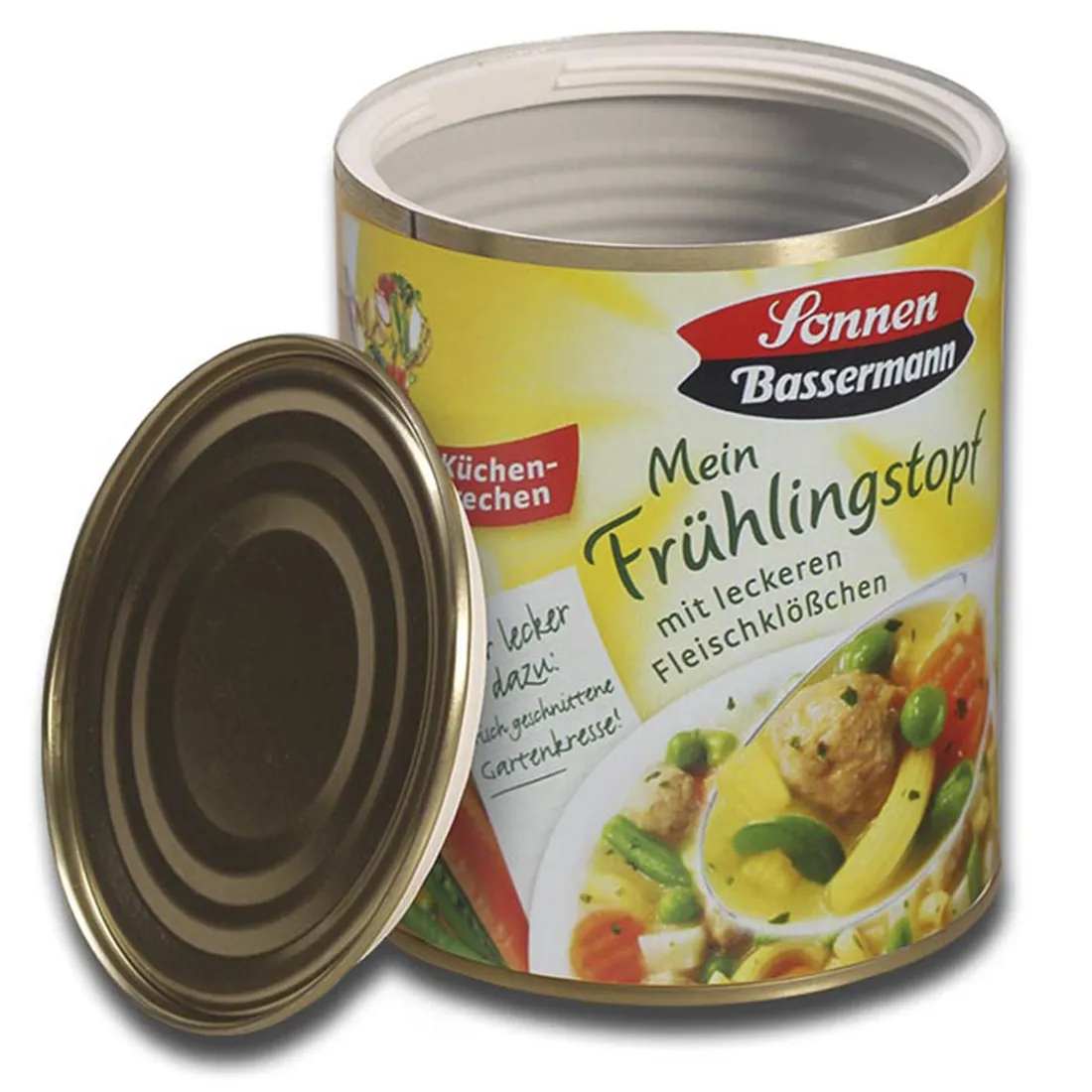 Denne ‘Frühlingstopf’ stash-boks ser ved første øjekast ud som en helt almindelig dåse med forårssuppe – men det er også præcis det, der gør den genial som et skjulested! Indvendigt gemmer dåsen på omkring 750 ml opbevaringsplads, perfekt til at holde dine værdigenstande som kontanter, smykker, stash diskret gemt væk. Dåsen er fremstillet af blik, og kommer med en original fødevareetiket på tysk, som ligner en ægte konservesdåse. Den er udstyret med en skjult skruehætte, som let kan skrues af og på, så du har hurtig adgang til dine hemmeligheder. Bemærk at dåserne er originale, og derfor kan have små buler eller tegn på brug, hvilket kun gør dem endnu mere autentiske.
