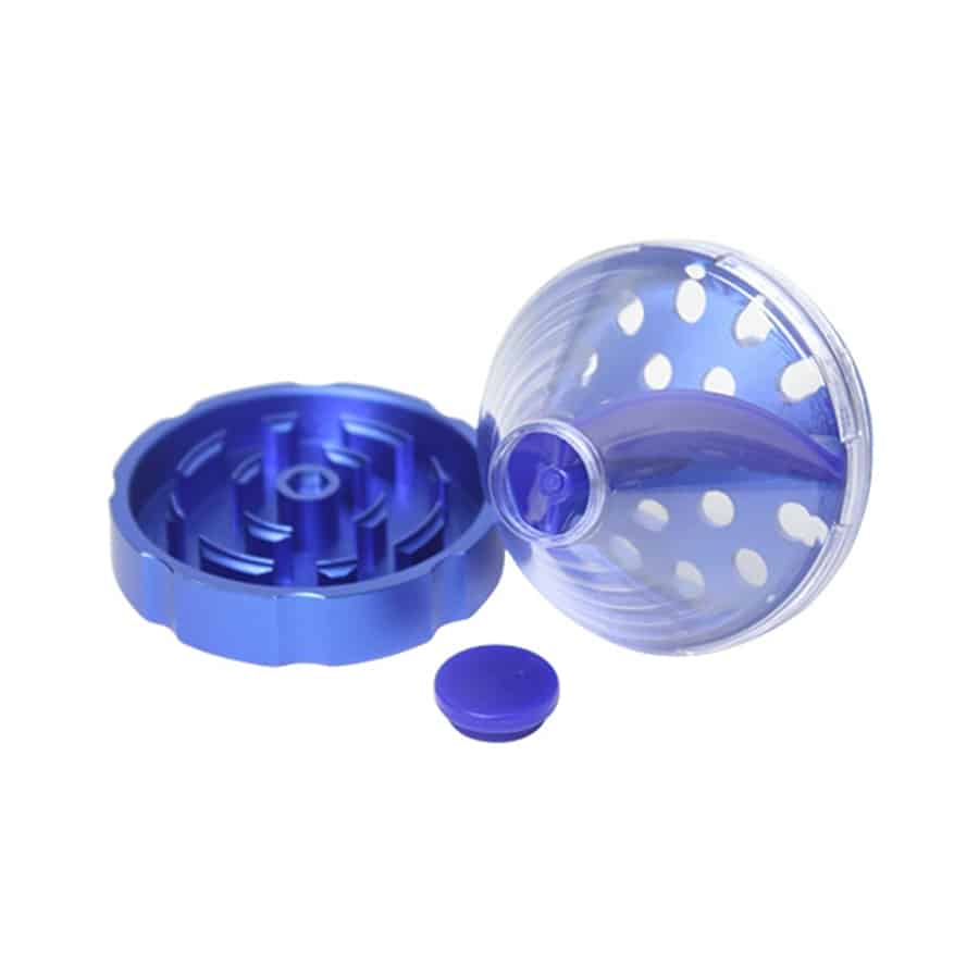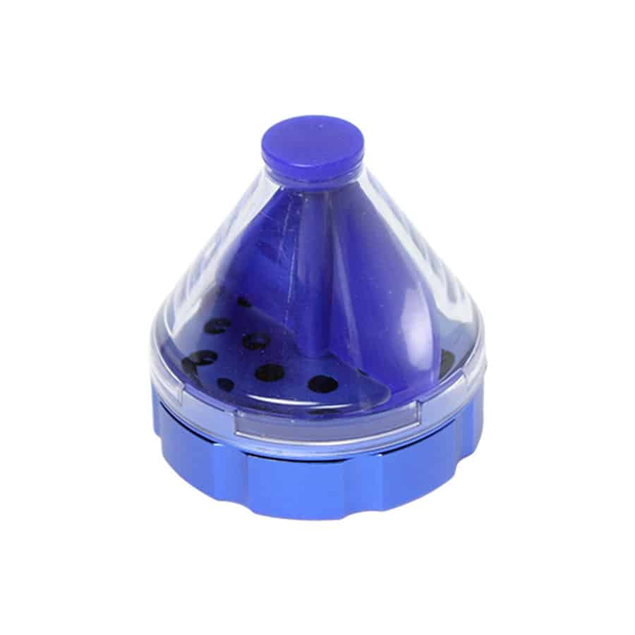 Med denne Super Sharp Funnel grinder, kan du grinde din urter direkte ned i din mixerskål eller mixerbakke, der med den lille udgang på toppen af grinderen, gør det super nemt. Ja faktisk kan du grinde det direkte ned i din pibe, bong eller vaporizer, hvis du foretrækker at ryge uden tobak. Den er fremstillet af aluminium i en blå og lilla farve, og har et gennemsigtigt akryl låg, med en indvendig silikone omdrejer, som nemt samler dit plantemateriale sammen.