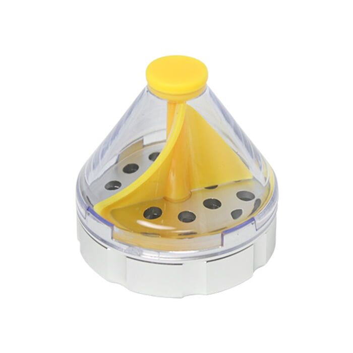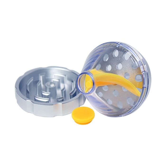 Med denne Super Sharp Funnel grinder, kan du grinde din urter direkte ned i din mixerskål eller mixerbakke, der med den lille udgang på toppen af grinderen, gør det super nemt. Ja faktisk kan du grinde det direkte ned i din pibe, bong eller vaporizer, hvis du foretrækker at ryge uden tobak. Den er fremstillet af aluminium, og har et gennemsigtigt akryl låg, med en indvendig gul silikone omdrejer, som nemt samler dit plantemateriale sammen.