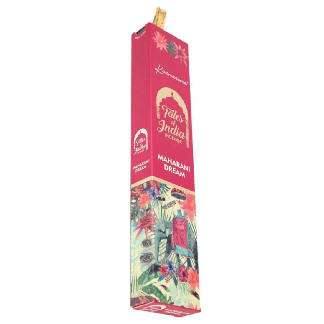 Maharani Dream røgelsespindene fra Tales of India, er en floral duftrejse fyldt med mystik og elegance. Inspireret af det gamle Indiens hoffølelse, og fortryllende havepaladser, blander denne røgelse tropiske blomster med en fyldig duft af tuberose, og en mere subtil tone af jasmin. Den varme og romantiske stemning gør den perfekt til aftenafslapning, meditation eller når der skal lidt mere magi i luften. Røgelsen er håndrullet i Indien, og pakket i en farverig æske med ca. 12 pinde pr. pakke. Brug altid en egnet holder, og lad aldrig røgelsespinde brænde uden opsyn.