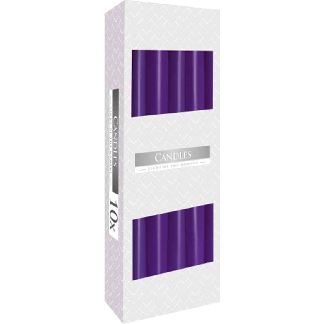 Taper stearinlys i en smuk lavendel farve, der bringer en rolig og elegant stemning til ethvert rum. Perfekte til alt fra middagsbordet og hyggelige aftener, til festlige lejligheder, catering og events. Lysene brænder i op til 7 timer, med en jævn og ren flamme uden røg eller dryp, så du får en god oplevelse og atmosfære.De er fremstillet i Polen af paraffin, overdyppet med farve, og leveres i en æske med 10 stk. Et klassisk valg til både hverdag og særlige anledninger.