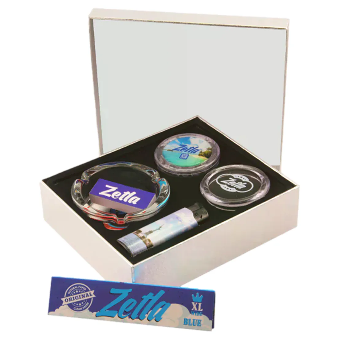 - Indeholder : Askebæger, plastik grinder, tiphæfte, lighter og pakke jointpapir